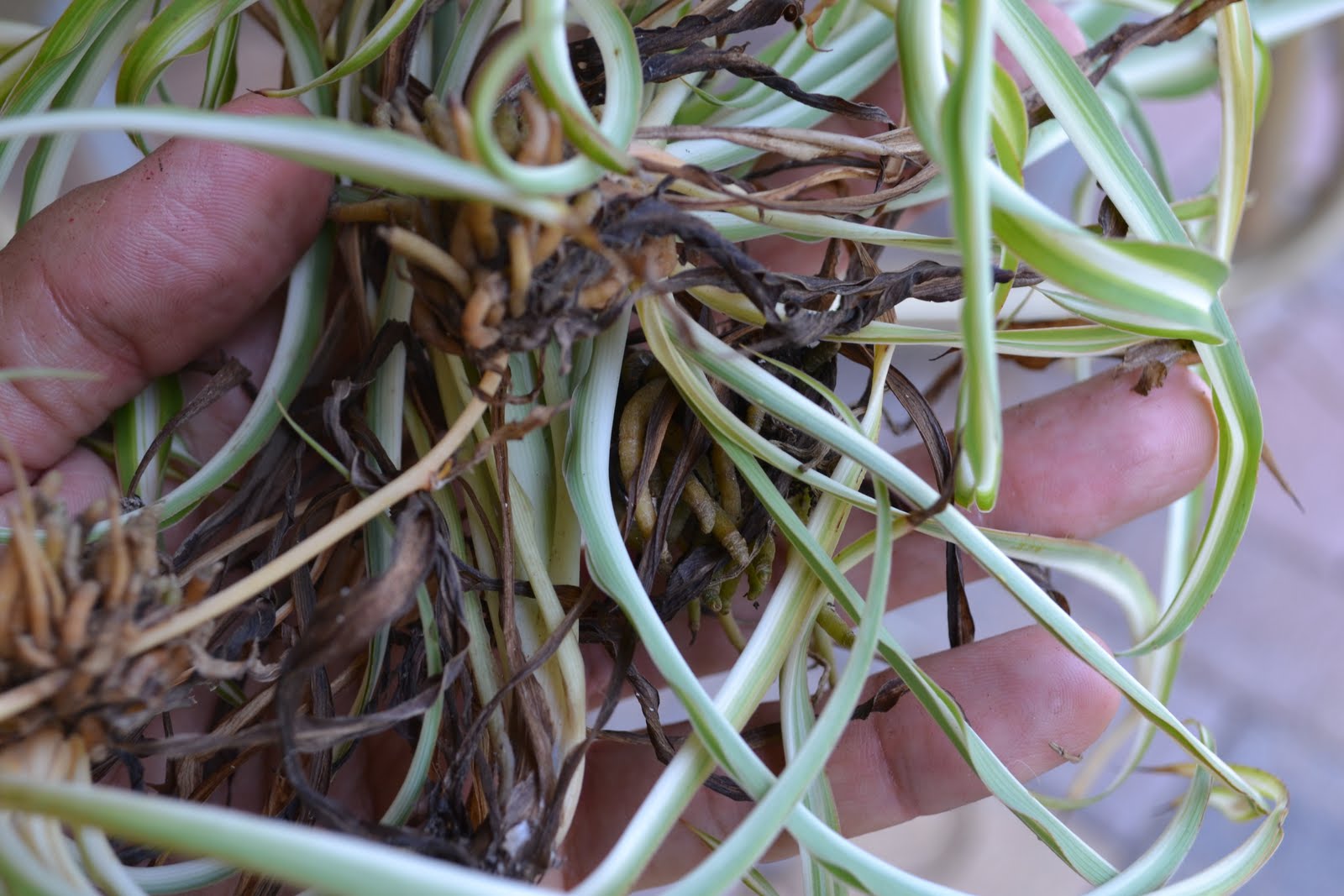 I need to clear out the dead ones and clean off the good ones. I have so many offspring, that I decide to harvest some of them to put into small starter pots. I start to break them apart gently and remove all the dead debris from around their roots.