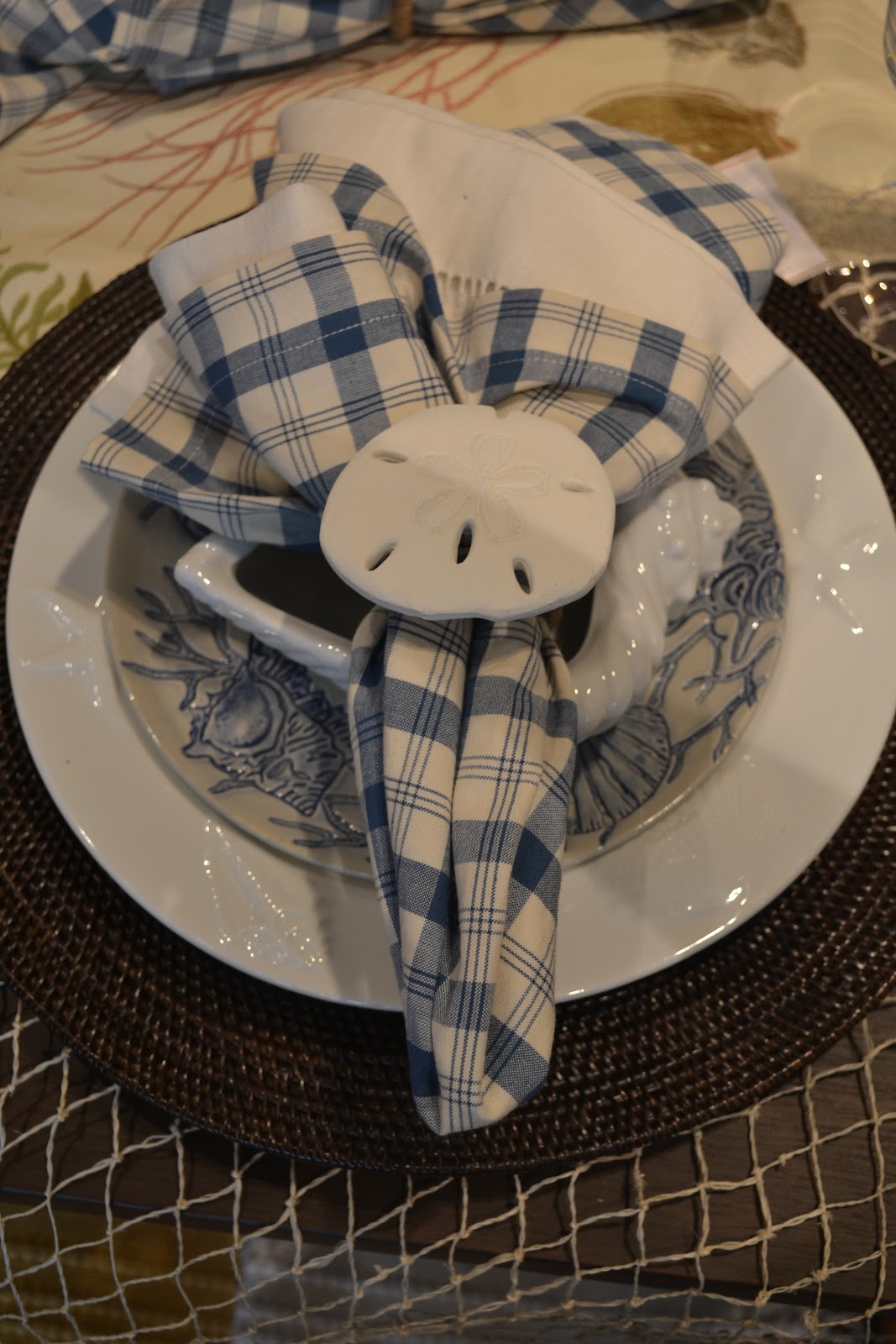 Even this little table setting below is charming and beachy. They stuck to a simple color palette, mixed in a little visual texture with the place-mat and netting. The classic blue and white ocean theme.....just yummy.