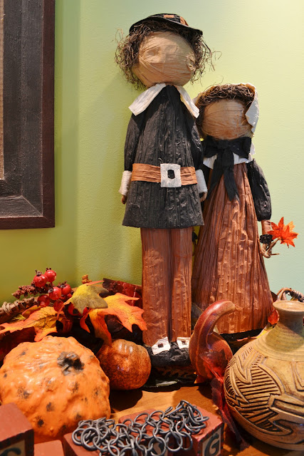 My mother, who has has been gone for over 17 years, bought me these little paper pilgrims at a crafts fair at a local high school. She saw me eyeballing them and knew at the time that I couldn't afford them. She bought them when I wasn't looking and showed up on Thanksgiving Day with them for me as a hostess gift. I pack them away by themselves with fresh tissue paper every year. I truly treasure these little people. They remind me of good times with my mom.