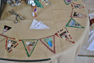 Cut all your parts out, the pennant backing, the burlap frame (or matting) and the little images in the triangular shapes. I made 13 pennants. Obviously you can make however many you want.