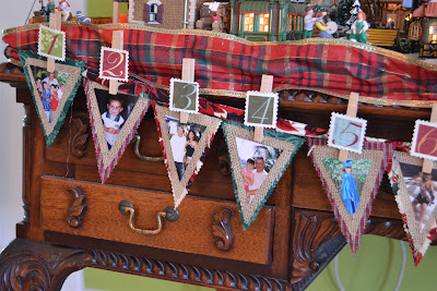 Many of you have fireplace mantels and neat hutches and such to display your Memory Photo Banner. I, however, live in Florida where fireplaces aren't prevalent. I decided to hang my banner to the front of the large desk that displays half of my Christmas in the City collection.