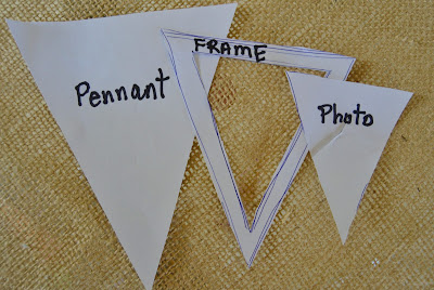 First make your templates out of copy paper. You can make your pennants whatever size you want. Mine are a finished size of about 4 1/2 wide by 5 1/12 tall. The frame (burlap) is about 3 3/4 inches wide by 4 1/2 tall. The photo triangle template is about 2 1/2 inches wide by 3 1/2 inches tall. The photo template was simply cut out of the frame template.